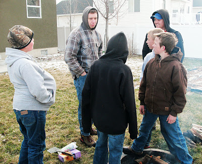 Hey well we had our first camp out planned for third week in March. That's perfect camping weather right. Spring started 3 days ago and it was in the 70's. Well on Friday morning I didn't feel good about going camping. A few hours later it started snowing. By the afternoon there were a couple of inches on the ground with more in the forecast and I didn't think that we wanted to start our camping season with a cold, wet and miserable night at willow park followed by an afternoon of service for the food bank. We decided to have a camp IN instead of a camp out. We cooked our foil dinners in my back yard and then played basketball in our driveway and then played games and watched a movie until about 10:00. Everyone had a great time. We didn't ruin any tents or gear and no one will be getting the flu for a week and a half. Here are some photomographic highlights: